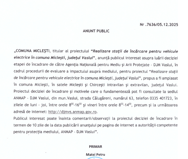 26 iulie 2025 - In Fără categorie By admin Comment off Anunțuri publice Download selected Caută documente Caută după titlu sau descriere… Search in Document title and description Document contents, title and description Căutare Resetare Selectare Toggle Titlu Dată Document Model anunt prealabil privind afisarea publica a documentelor Miclesti 2, 7, 8, 16, 18, 37 (2) ( doc, 32 KB ) (25 descărcate) 15 dec. 2025 Imagine Anunt Realizare statii de incarcare electrice ( png, 563 KB ) (18 descărcate) 05 dec. 2025 pdf Convocare proprietari de teren ( pdf, 1.12 MB ) (34 descărcate) 16 oct. 2025 Next Carieră